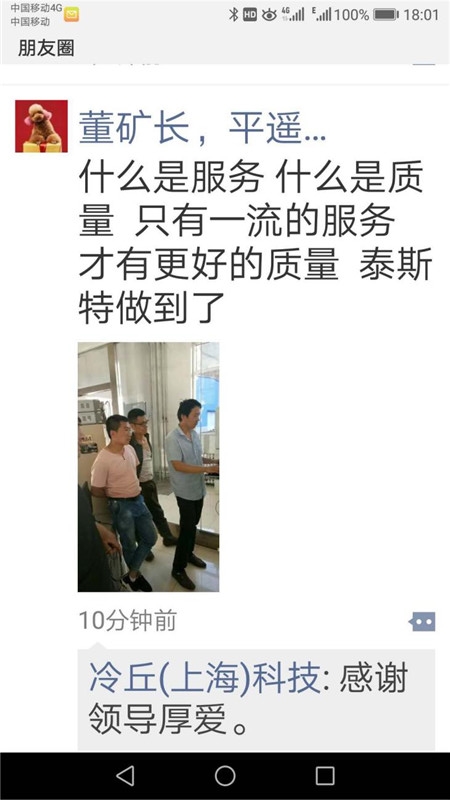 2018年6月28日,工程部技术工程师翟硕飞在平遥兴盛鸿发矿进行售后服务过程中,体现出的业与态度获得了客户的好评,平遥煤化董矿长将其转发朋友圈,为泰斯点赞,高度赞扬了泰斯业、负责、高的工作作风,这是次客户在公开场合对公司进行点赞,并进行传播。这是泰斯公司的光荣,也是整个售后团队的光荣。